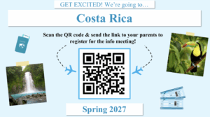 We are pleased to share we having a Costa Rica educational tour happening in Spring 2027 and your student is invited to join us.